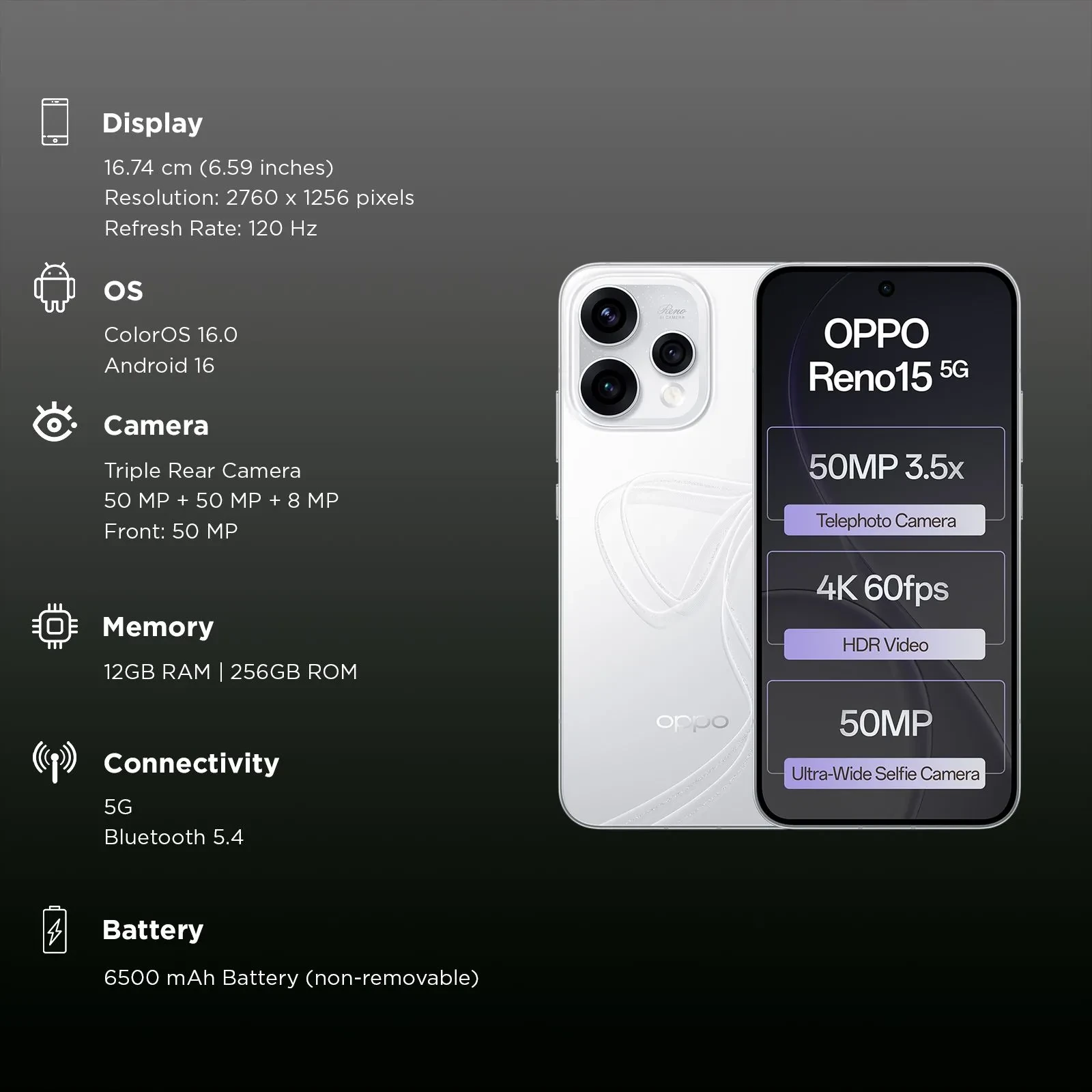Oppo Reno15 5G (12GB RAM, 256GB, Glacier White)